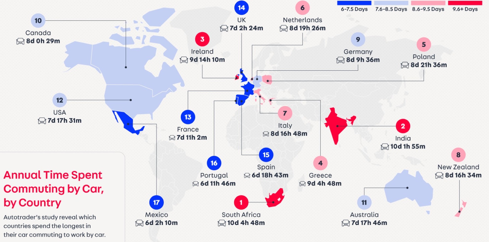 Gli italiani passano oltre otto giorni all’anno in auto solo per andare e tornare dal lavoro, un tempo che colloca il nostro Paese al settimo posto mondiale secondo lo studio “Global Commuter Comparison” di Autotrader.