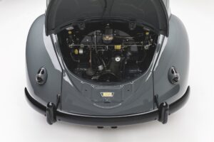 Forse per questo, al netto dell’aspetto un po’ ruvido dei dettagli in nero opaco, l’operazione resta misurata, educata. E reversibile. “L’ho considerato un punto chiave fin dall’inizio, non ho mai pensato a un dragster o ad altre elaborazioni senza ritorno. Non ho voluto assolutamente tagliare o modificare porzioni di carrozzeria. Anzi, il primo passo è consistito in un restauro conservativo”. Così molti componenti, fra cui i cristalli e perfino parte di bulloni e minuteria, restano di primo equipaggiamento, mentre per altri si è scelto di affidarsi alle alchimie di specialisti riconosciuti: la selleria, per esempio, è rifiorita sotto le cure di un artigiano che lavora per il museo dedicato all’Auto del Popolo ad Hannover.