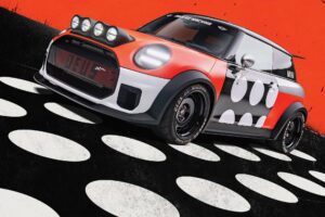 “The Machina”, invece, è una Mini JCW benzina da 231 cv, caratterizzata da livrea rosso-bianco-nera e richiami diretti al motorsport, dai fari supplementari al diffusore posteriore ispirato alle corse. All’interno troviamo cinture a cinque punti, roll-bar e materiali grezzi, a sottolineare il legame con l’autenticità della guida sportiva.
