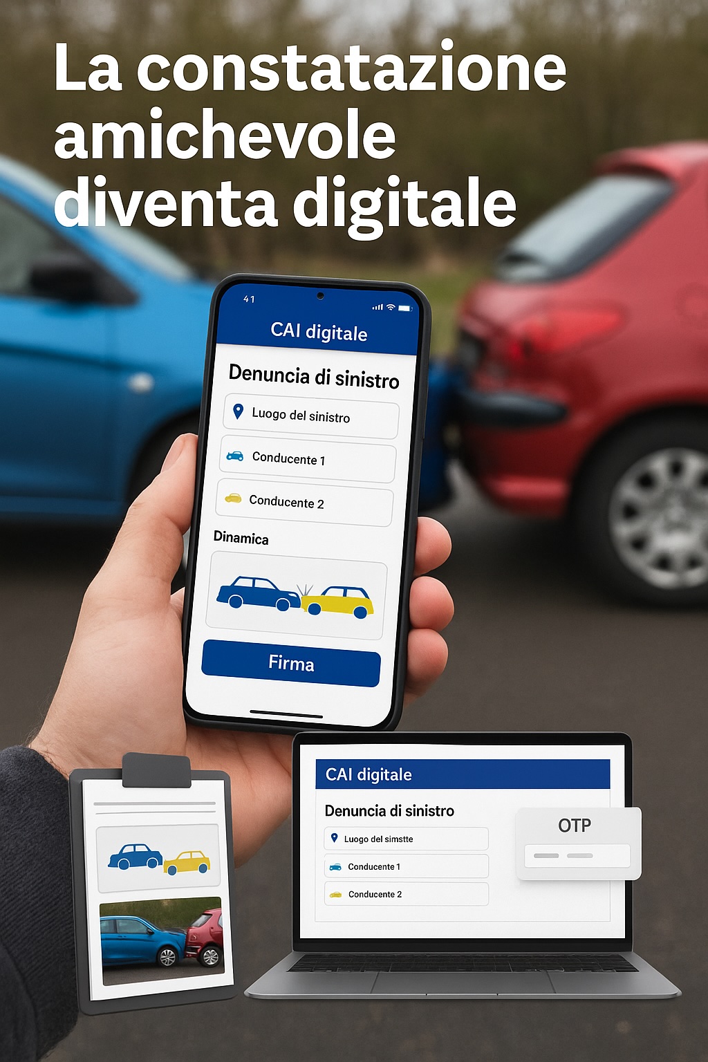 Il nuovo Regolamento IVASS ha imposto alle compagnie assicurative l’obbligo di mettere a disposizione degli assicurati strumenti digitali per la compilazione e l’invio della denuncia di sinistro. Dal 1° luglio 2025 la constatazione amichevole è ufficialmente diventata digitale (obbligatoria da Aprile 2026), assumendo la forma del CAI digitale (Constatazione Amichevole di Incidente). È un modulo elettronico compilabile direttamente da smartphone, tablet o PC, senza più bisogno del supporto cartaceo.