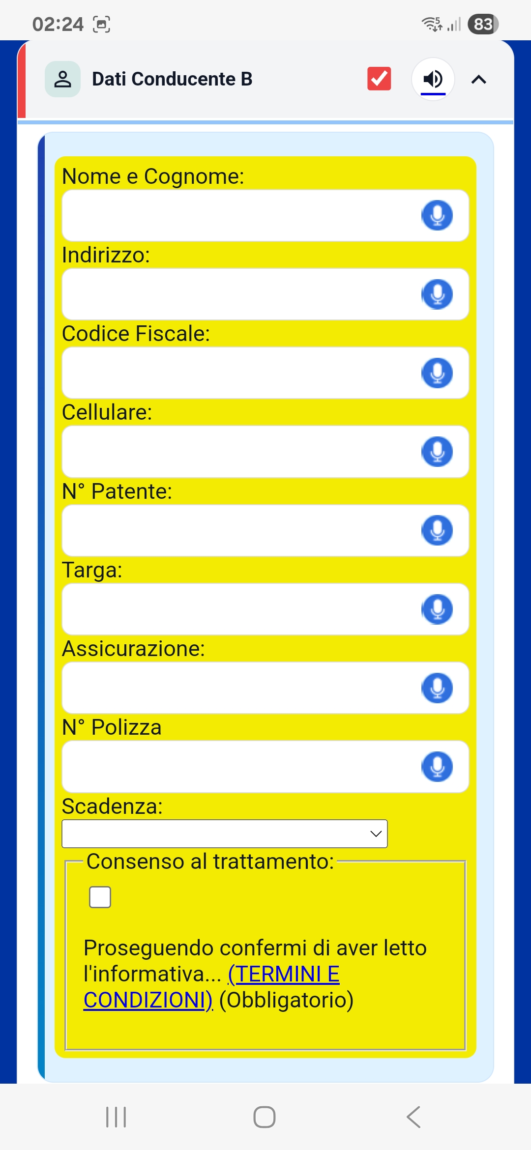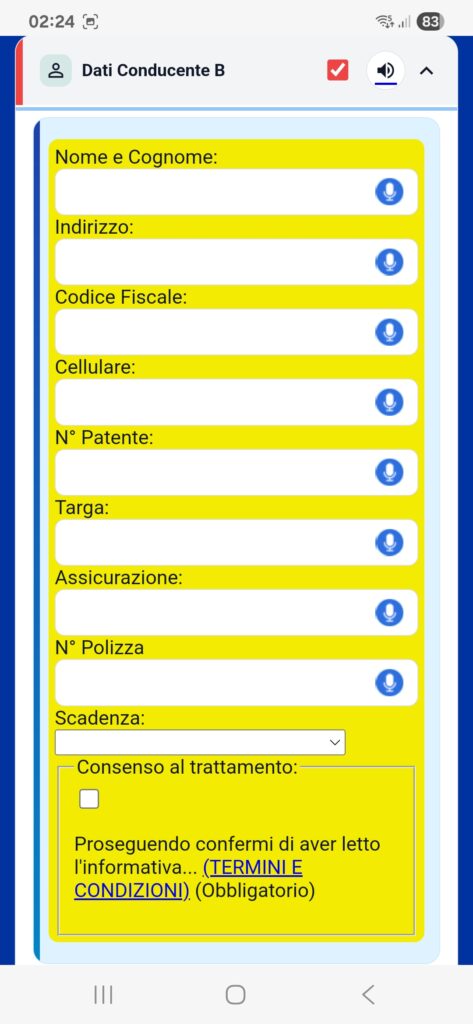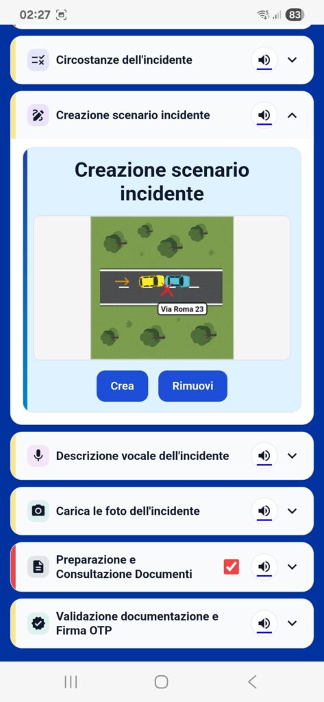 Il sistema consente di selezionare il tipo di incidente, scegliere tra veicoli blu o gialli, aggiungere dettagli e generare automaticamente lo scenario da inserire nel documento finale. La descrizione dell’accaduto può essere effettuata anche vocalmente, rendendo il processo ancora più immediato. Alcuni dati sono obbligatori, altri facoltativi, ma l’interfaccia guida l’utente passo dopo passo fino al completamento. Al termine del processo, il documento può essere scaricato.