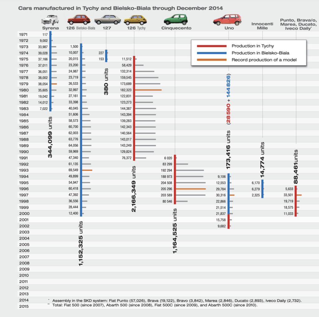 La produzione della Fiat iniziò a Tychy nel 1975 e 126 cessò, nel 1991 (complessivamente sono state prodotte 2.166.349 unità), per fare posto alla Fiat Cinquecento. Il modello 126p continuò ad essere prodotto, con volumi ridotti, presso gli stabilimenti FSM di Bielsko-Biała fino all’anno 2000 con motorizzazioni fino a 700 cc: l’ultima unità esce dalle linee il 22 settembre 2000.