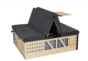 Il box ha una larghezza di 119 cm, una profondità di 137 cm, e arriva ad un’altezza di 90 cm (50 cm sono di seduta). In configurazione letto lo spazio dedicato al sonno è pari a 200 x 120 cm (con sponde laterali regolabili fino alla larghezza del veicolo). Quello che fa la differenza rispetto ad altri prodotti analoghi, sono la miriade di funzioni e accessori di cui è (o si può) corredare.