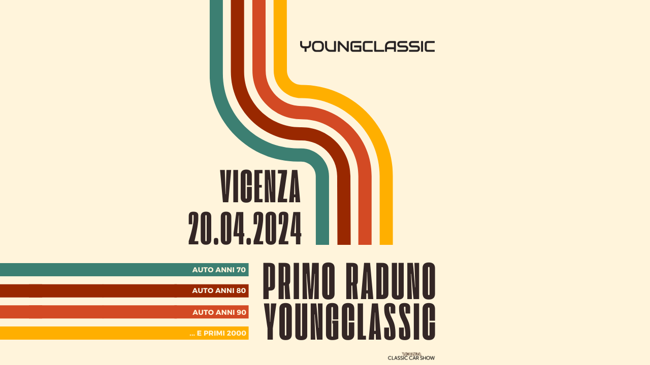 Siamo felici di informarti che in occasione di Vicenza Classic Car show che si svolgerà dal 19 al 21 aprile, ci sarà il primo raduno di Youngclassic! E ti promettiamo che sarà indimenticabile. Ci vediamo sabato 20 aprile presso lo spazio esterno del polo fieristico.