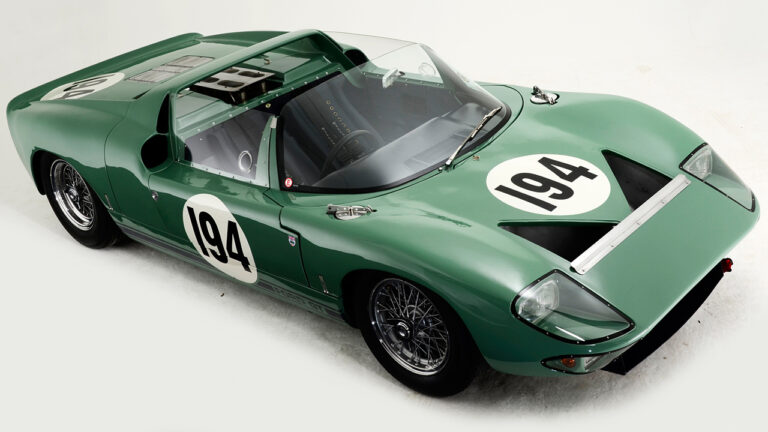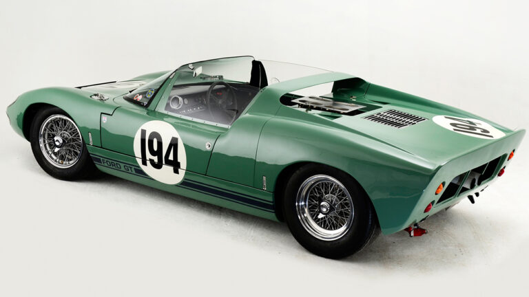 Questo particolare esemplare fu testato per la prima volta alle prove di Le Mans del 1965 da John Whitmore prima di essere schierato come concorrente alla Targa Florio dello stesso anno. Verniciata in tonalità Linden Green e con Whitmore affiancato da Bob Bondurant come copilota, l’auto raggiunse il terzo posto fino a quando non fu costretta a ritirarsi prematuramente per un’incidente nell’ultimo giro di gara. L’idea della carrozzeria roadster viene abbandonata e per il 1966 viene preferita la configurazione coupé. Il resto è storia…