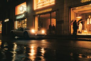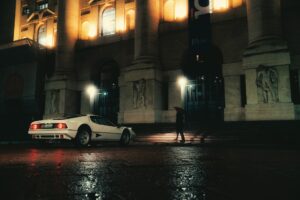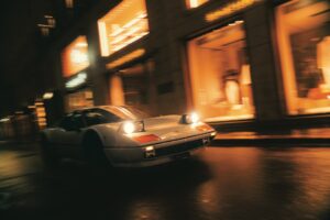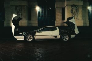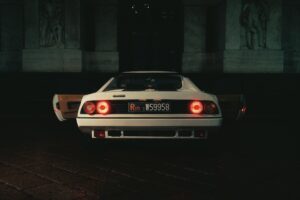Mentre è ritratta in una notte milanese di pioggia, la 512 rompe il silenzio delle vie del Quadrilatero della Moda con inquieta eleganza. Piazza Meda, Montenapo, poi basta stuzzicare l’acceleratore e sta già paralizzando gli sguardi dei rari passanti in via Manzoni. Nella sua candida livrea pastello, è ancora più desiderabile. Dei 1007 esemplari costruiti fra il 1981 e il 1984, solo pochissime BBi con la guida a sinistra sono uscite da Maranello in monocolore bianco: la fascia inferiore nera della versione precedente poteva essere richiesta solo come optional.