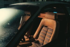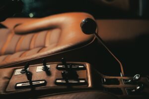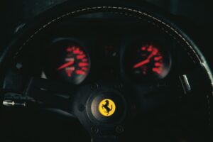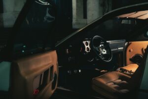 Anche se la gamba destra è sempre in contatto con il volante o il pomello della leva del cambio, la pedaliera centrale ben distanziata mette a proprio agio. La plancia imbottita in pelle chiara è fortemente caratterizzata dagli otto quadranti neri con indicatori in arancione fluo, sportivi e anni 70 come un cronografo Heuer Autavia Orange Boy. La radio Pioneer marchiata con il Cavallino rampante è per i cultori: ha l’equalizzatore a cinque bande separato, a sinistra del quadro strumenti. Gli interni in pelle Connolly color crema sono impreziositi dagli inserti antisudore in tessuto a costine firmato Ermenegildo Zegna. Sul tunnel centrale, insieme allo switch della regolazione elettrica dei retrovisori e gli alzavetri, spiccano i cursori di regolazione del condizionatore Borletti, che rinfresca l’abitacolo sfruttando un circuito indipendente da quello del riscaldatore. Un dettaglio fetish? Non è mai stata tolta la plastica protettiva originale dai brancardi. Quello sinistro include un ampio portacenere con accendisigari a scomparsa. Come a dire che, quelli, erano tempi in cui guidare e fumare erano un tutt’uno, al volante di una gran turismo da conquistatore.