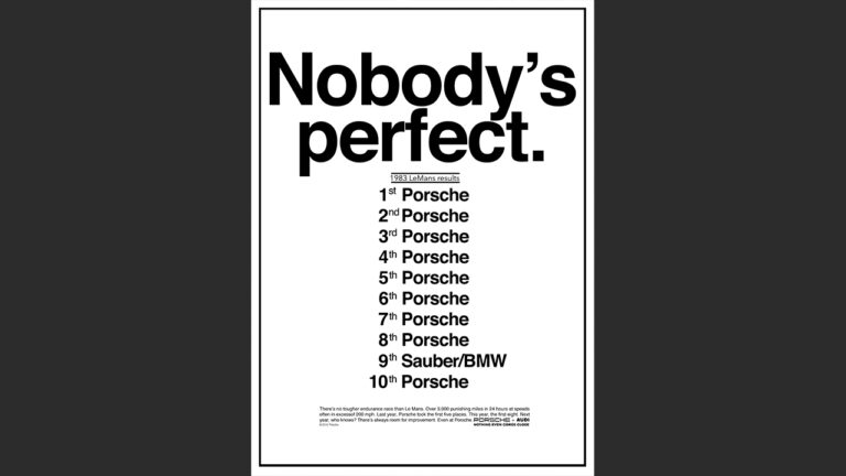 Ogni tanto si sente parlare di pubblicità comparativa. È un’arma difficile da utilizzare perché non sempre può essere bene interpretata dai destinatari del messaggio. Ci sono però casi in cui la comparazione non solo è efficace, ma è anche una prova di sottile intelligenza. Esempio perfetto è quello di Porsche dopo la vittoria a Le Mans nel 1983 con la Porsche 956 che non solo conquistò la prima posizione, ma occupò 9 dei primi 10 posti in classifica. Il celebre poster pubblicitario “Noboby’s Perfect” – nessuno è perfetto – per celebrare l’evento lascia poco spazio alle interpretazioni sottolineando un vero e proprio dominio.