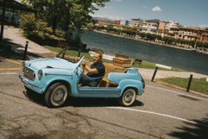 Tra le classiche la piccola Fiat 600 Jolly, elegante spiaggina con tendalino frangisole e interni in vimini che deriva dalla utilitaria simbolo del miracolo economico, la Seicento del 1955, della quale abbiamo festeggiato i settant’anni sul numero di marzo.