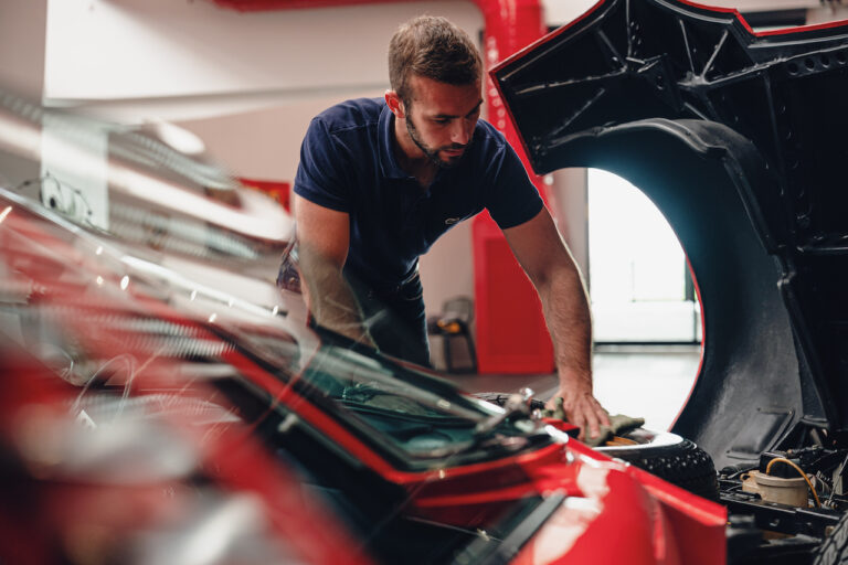 Fuori dal museo, nel frattempo, una bella brezza di campagna ha spazzato via le nuvole. Chiediamo a Ferruccio se e quanto fosse preoccupato della pioggia. “Non molto, in realtà. ll nonno ha vissuto molti anni, quelli conclusivi della sua vita, nel suo buen retiro umbro, e questa è la macchina con cui di solito amava girare per la tenuta, tra i filari delle vigne, su e giù per strade sterrate e sconnessioni varie. La tirava fuori e… via per le strade bianche! Ha 385 cavalli, ma volendo davvero si guida senza troppe accortezze, come un’auto di tutti i giorni”.
