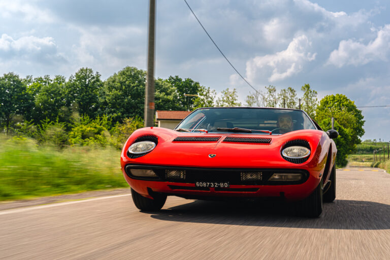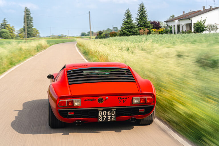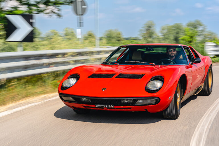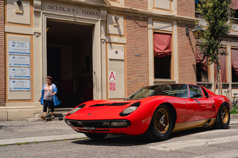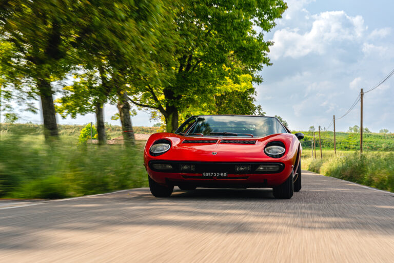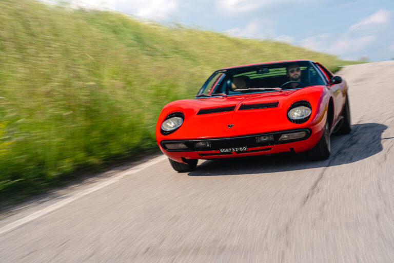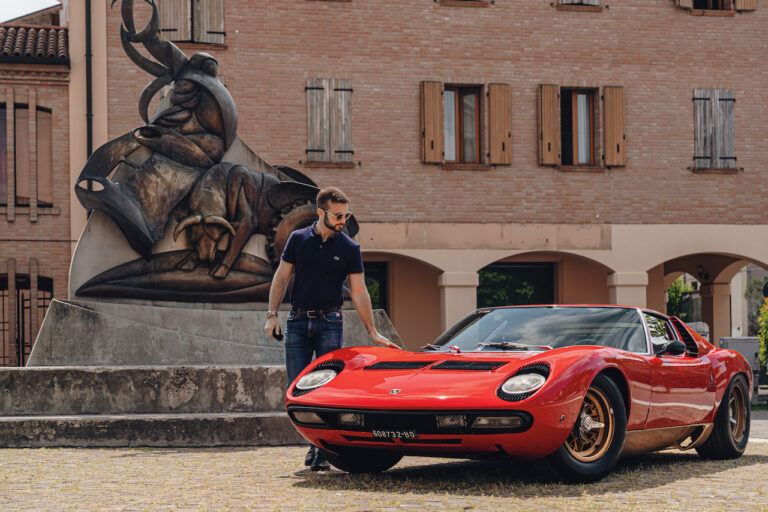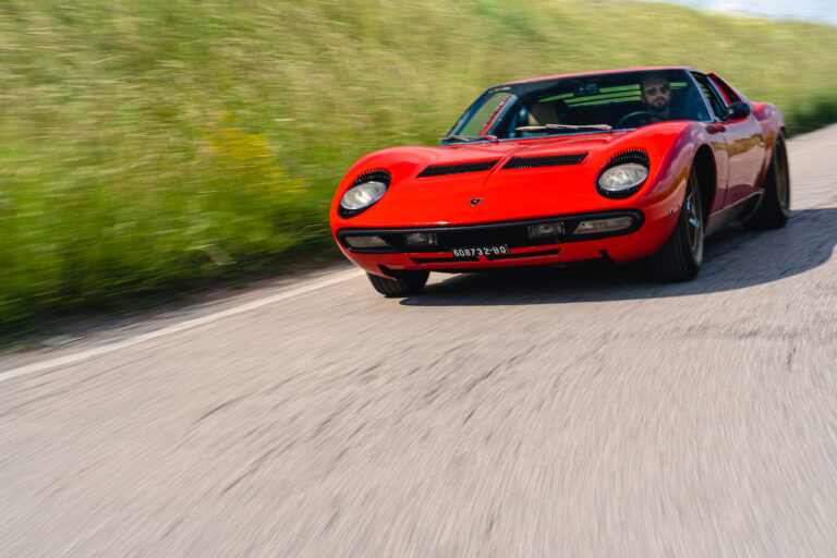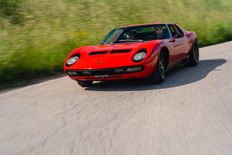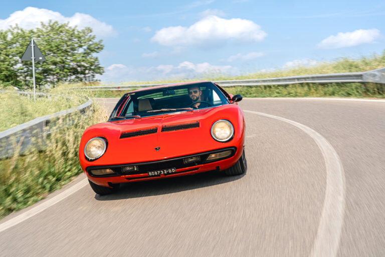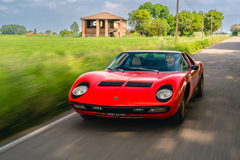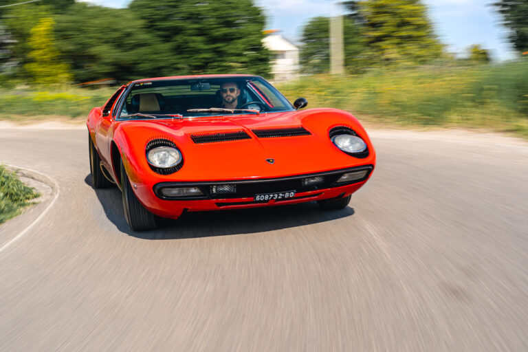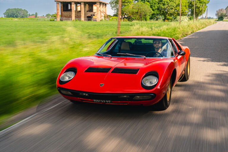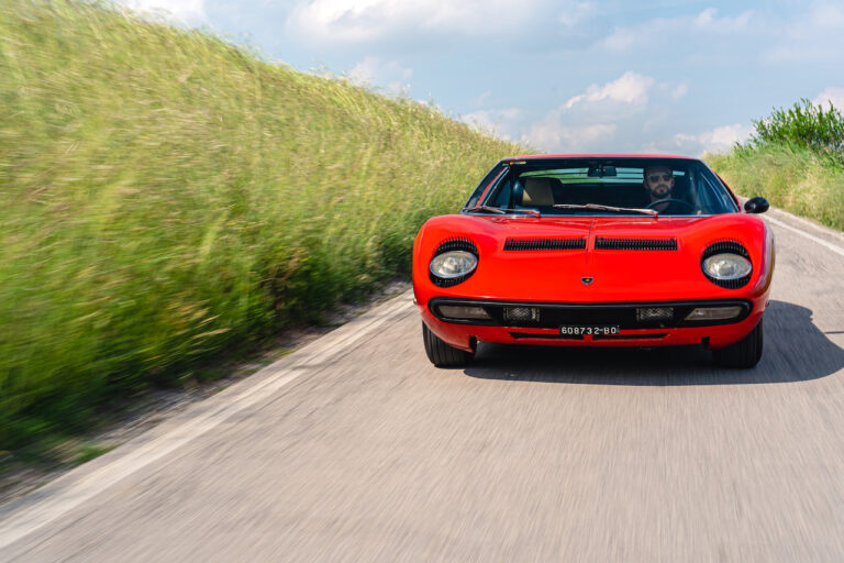 Il sole ora si sta abbassando sui campi perfetti dell’Emilia e sul rosso fuoco della carrozzeria. Filiamo via bassi e veloci sull’asfalto delle strade di campagna, dove l’auto lascia cantare il suo meraviglioso propulsore, con i furgoncini sulla via di casa che dopo una giornata di lavoro ci sfanalano e ci suonano il clacson. Una Miura, le sue perfette condizioni e alcuni piccoli segni lasciati dal tempo, testimonianza di una vita vissuta a pieno, che Ferruccio “junior” e suo padre Tonino hanno saputo preservare con sapienza e gratitudine.