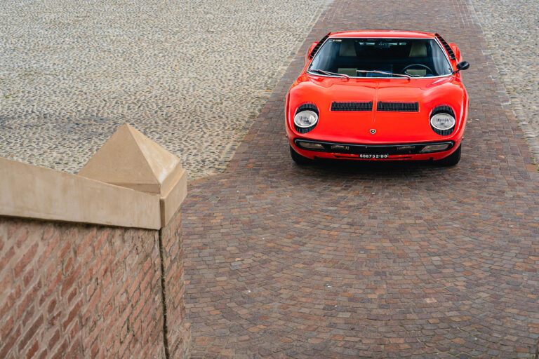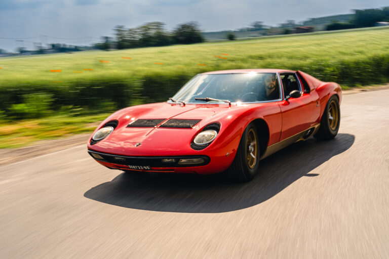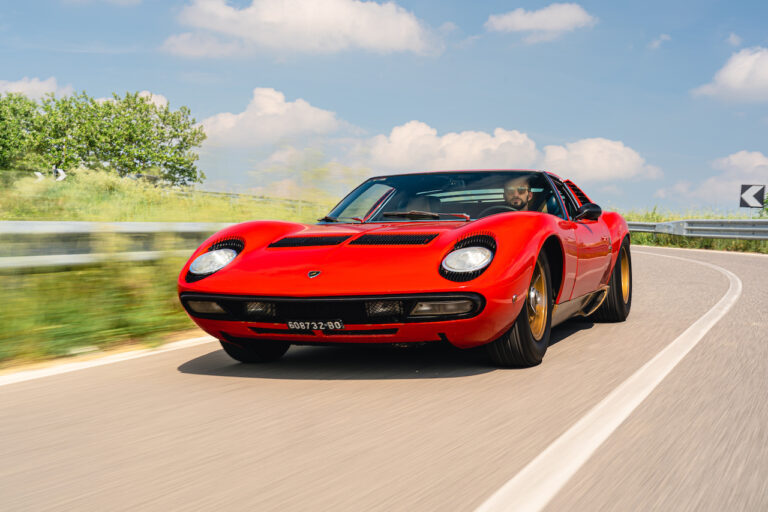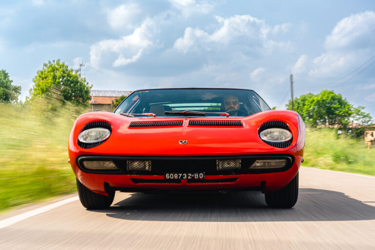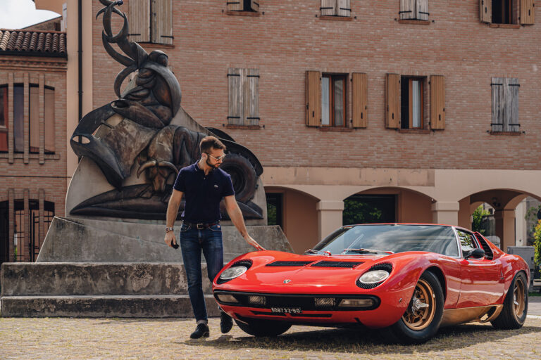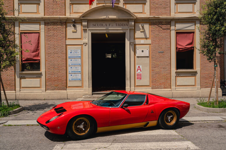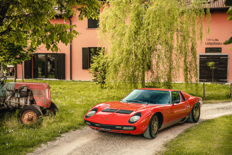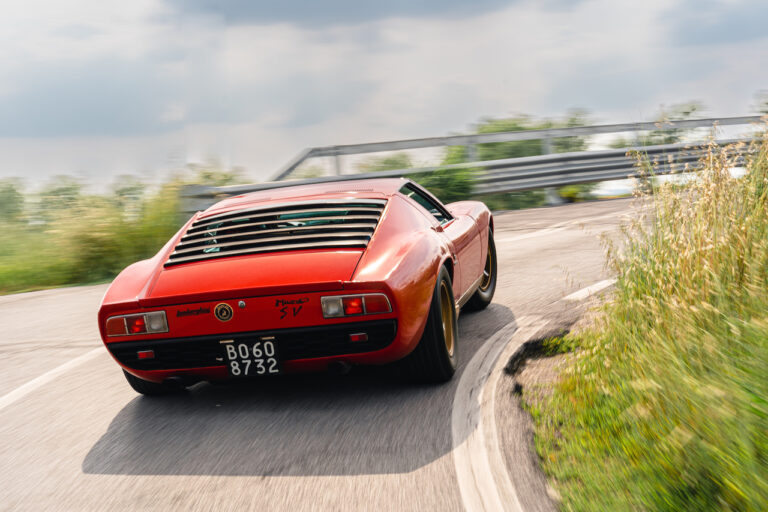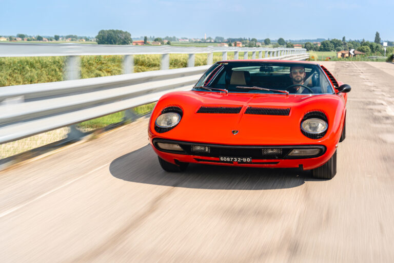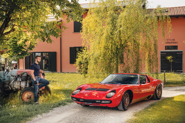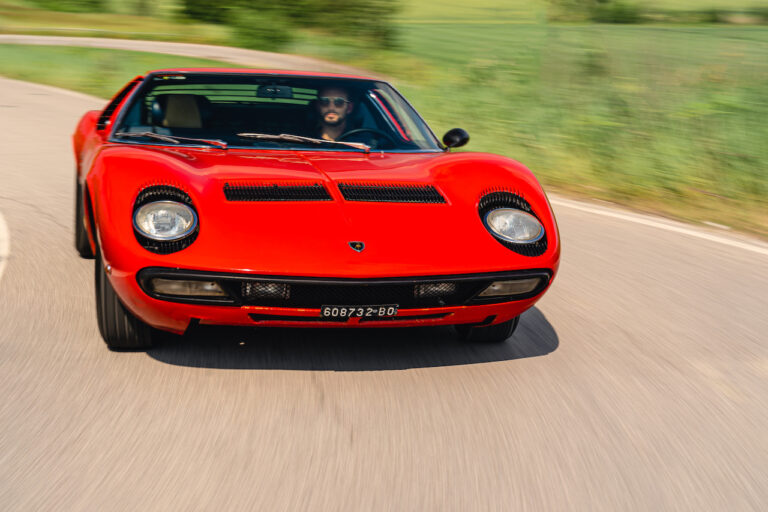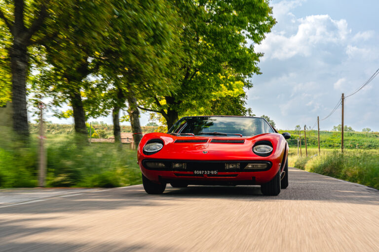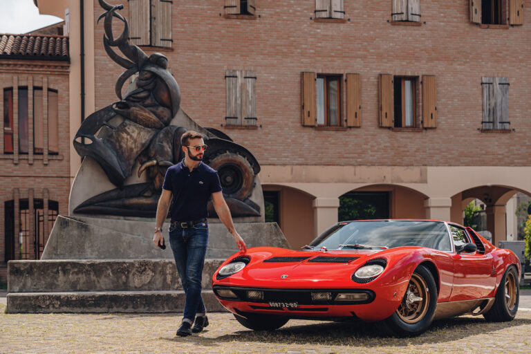 Il sole ora si sta abbassando sui campi perfetti dell’Emilia e sul rosso fuoco della carrozzeria. Filiamo via bassi e veloci sull’asfalto delle strade di campagna, dove l’auto lascia cantare il suo meraviglioso propulsore, con i furgoncini sulla via di casa che dopo una giornata di lavoro ci sfanalano e ci suonano il clacson. Una Miura, le sue perfette condizioni e alcuni piccoli segni lasciati dal tempo, testimonianza di una vita vissuta a pieno, che Ferruccio “junior” e suo padre Tonino hanno saputo preservare con sapienza e gratitudine.