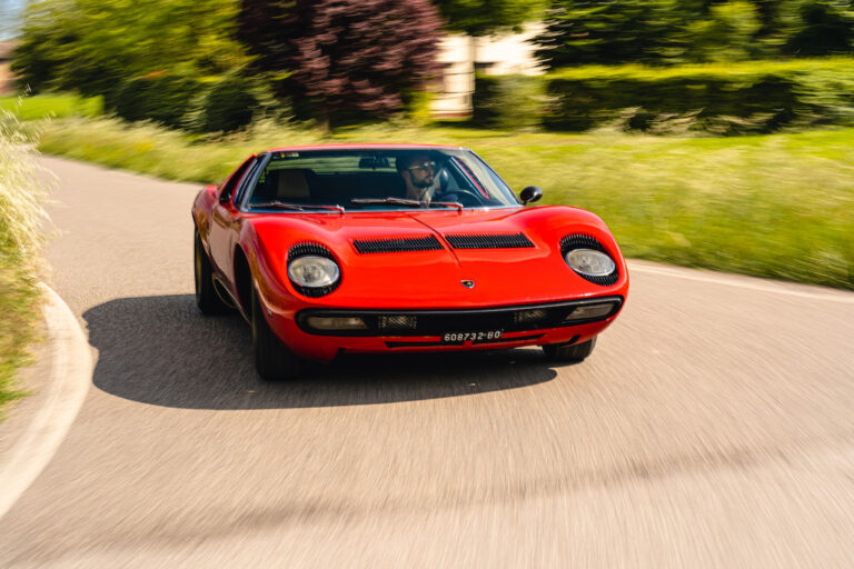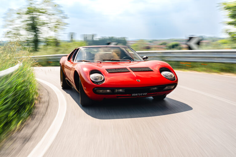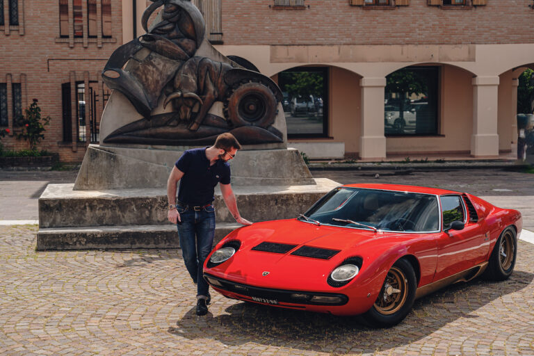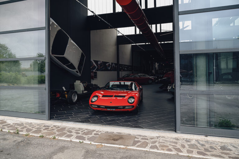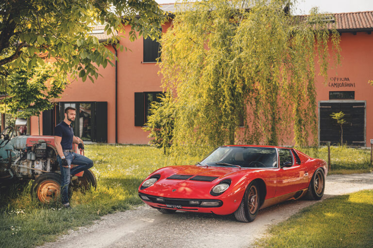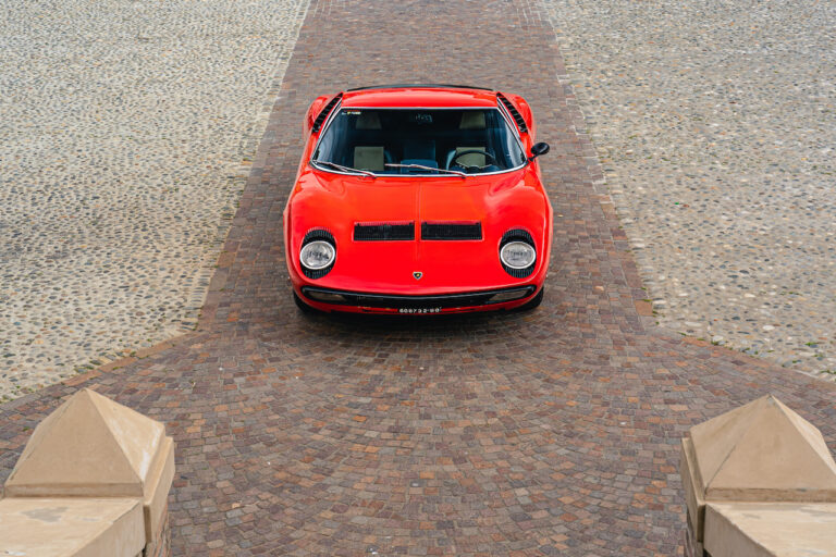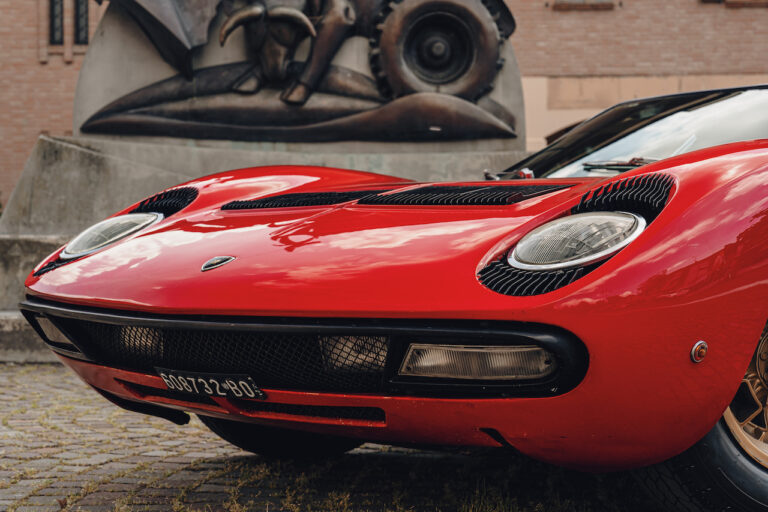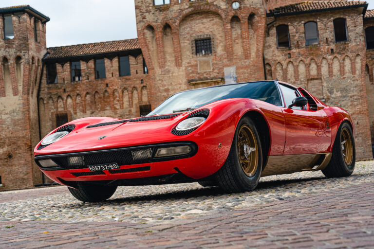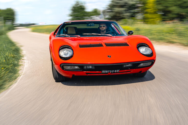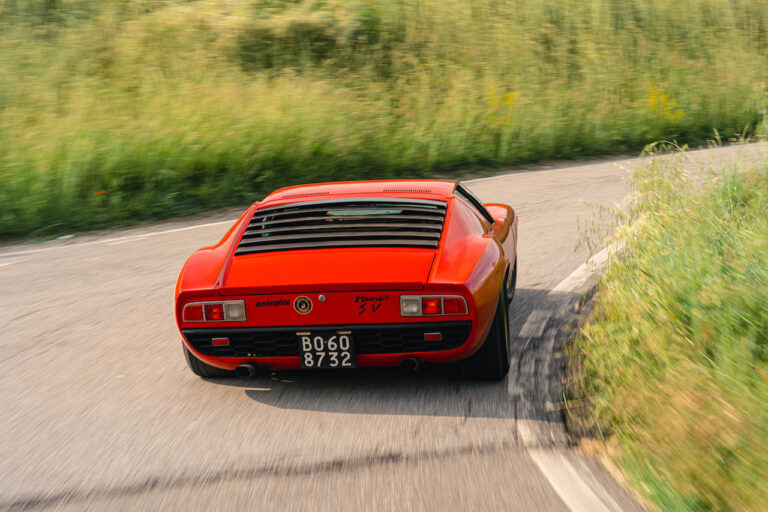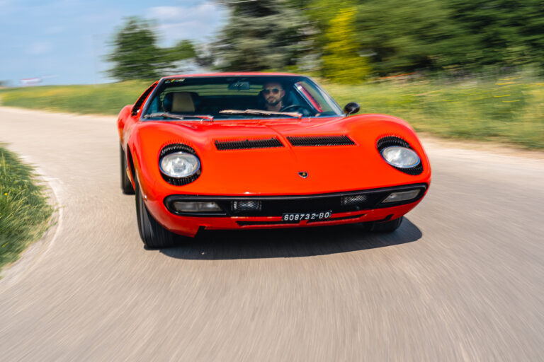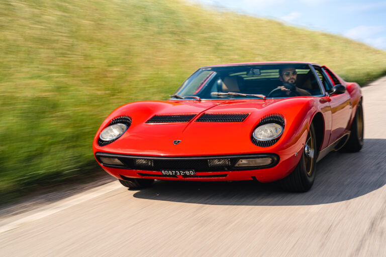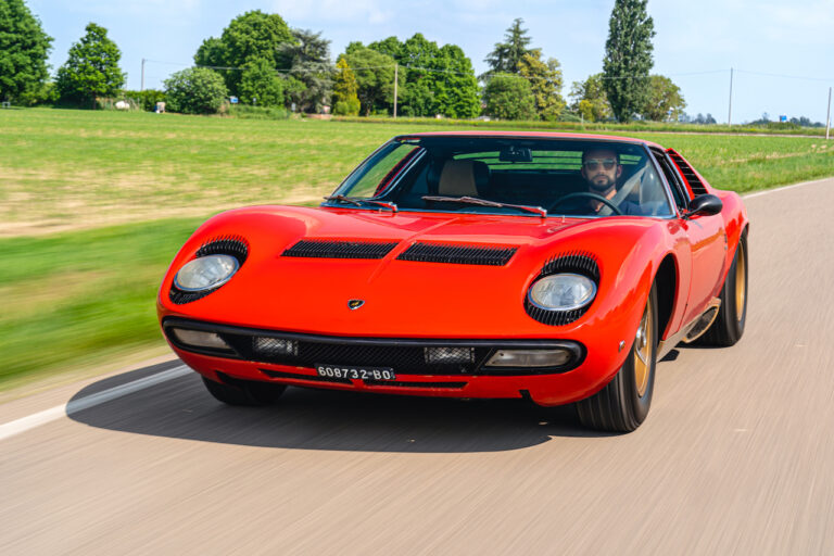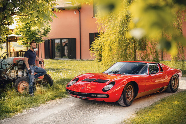 Il sole ora si sta abbassando sui campi perfetti dell’Emilia e sul rosso fuoco della carrozzeria. Filiamo via bassi e veloci sull’asfalto delle strade di campagna, dove l’auto lascia cantare il suo meraviglioso propulsore, con i furgoncini sulla via di casa che dopo una giornata di lavoro ci sfanalano e ci suonano il clacson. Una Miura, le sue perfette condizioni e alcuni piccoli segni lasciati dal tempo, testimonianza di una vita vissuta a pieno, che Ferruccio “junior” e suo padre Tonino hanno saputo preservare con sapienza e gratitudine.