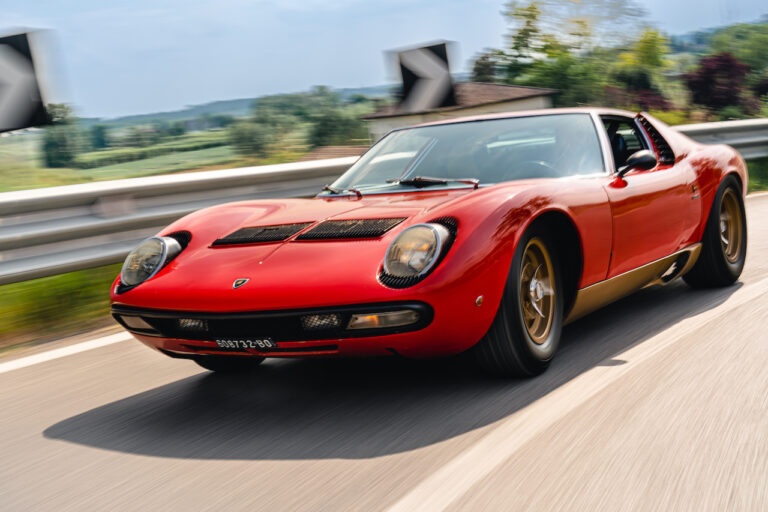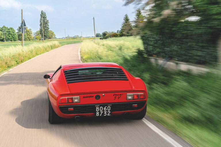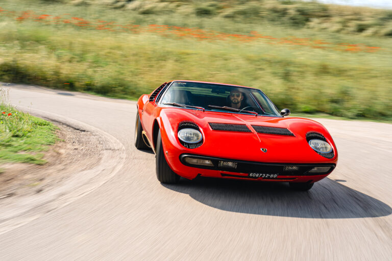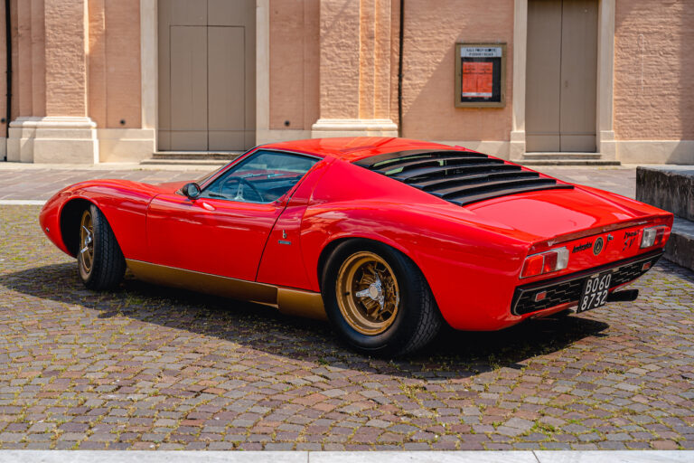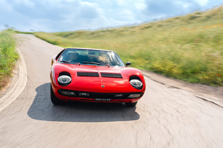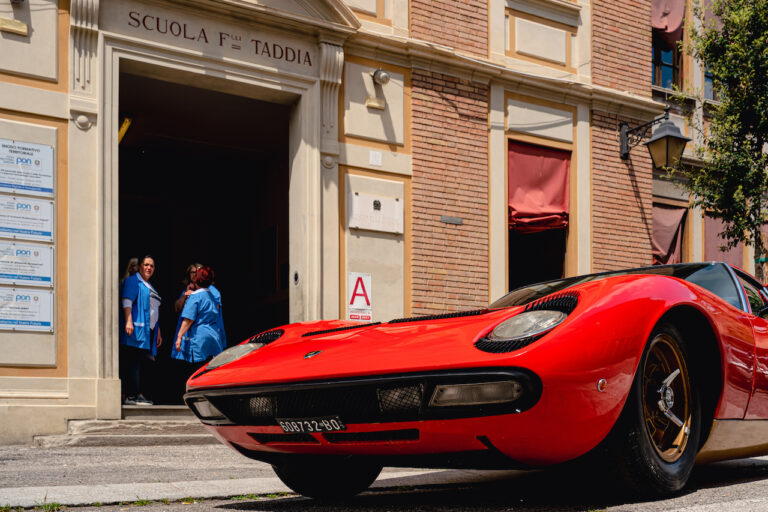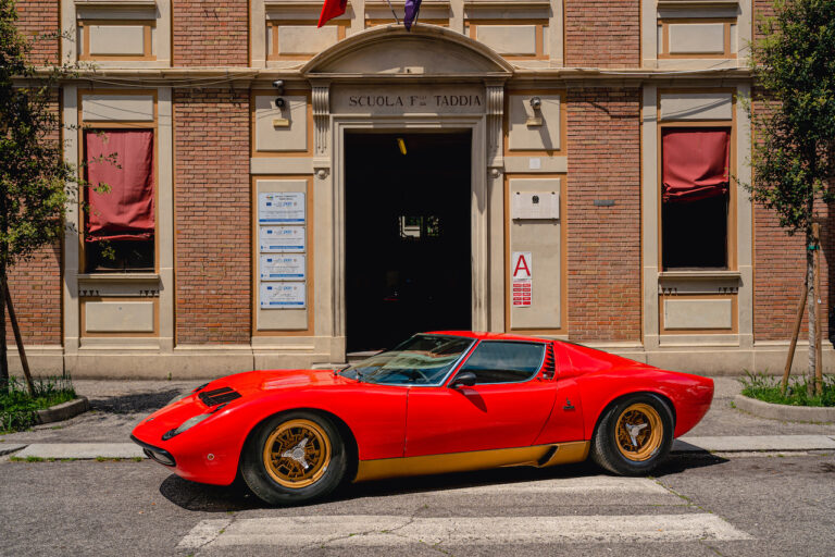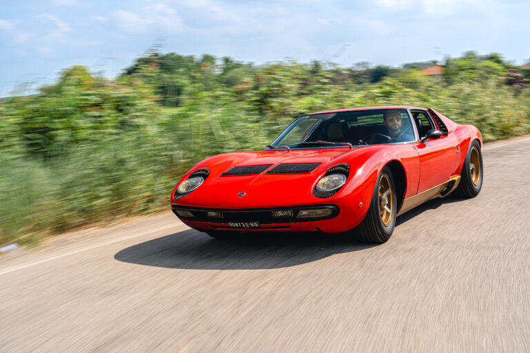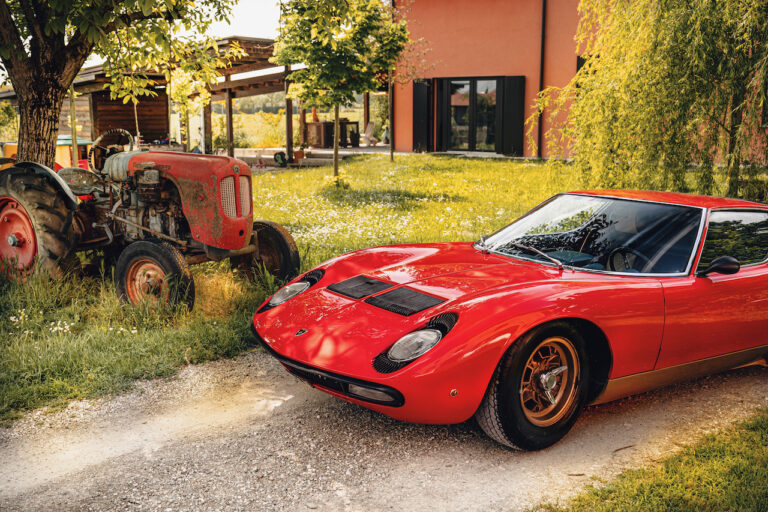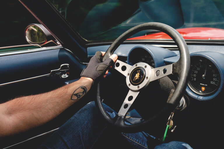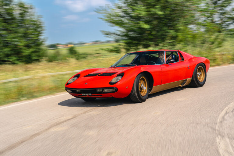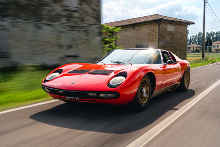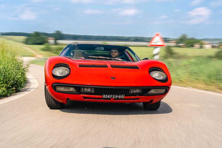 Il sole ora si sta abbassando sui campi perfetti dell’Emilia e sul rosso fuoco della carrozzeria. Filiamo via bassi e veloci sull’asfalto delle strade di campagna, dove l’auto lascia cantare il suo meraviglioso propulsore, con i furgoncini sulla via di casa che dopo una giornata di lavoro ci sfanalano e ci suonano il clacson. Una Miura, le sue perfette condizioni e alcuni piccoli segni lasciati dal tempo, testimonianza di una vita vissuta a pieno, che Ferruccio “junior” e suo padre Tonino hanno saputo preservare con sapienza e gratitudine.