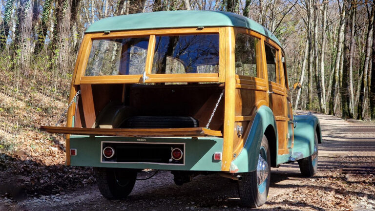 Questa volta il mio occhio è caduto sulla Peugeot 402B Limousine Break Woodie. Nata come berlina 402B nel 1939 fu destinata al Ministero dell’Aria e dotata del ultra-raro cambio semi-automatico Cotal, un accessorio che all’epoca costava quasi quanto la vettura stessa. Finita la guerra, come spesso accadde anche in Italia, la vettura venne venduta e fu trasformata in giardinetta con le fiancate in legno. In seguito passò quindi nelle mani di Lindsay Owen Jones, noto sia per esser stato presidente della L’Oreal dal 1988 al 2011 sia per essere arrivato quinto alla 24 Ore di Le Mans del 1996, ovviamente non con questa macchina!