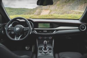 Qui, peraltro, si sarebbe trattato di lasciare fuori dallo schermo i già citati comandi del climatizzatore, che di fatto hanno due sole funzioni, basilari: alzare e abbassare la temperatura. Questa razionalizzazione, d’altro canto, ha liberato un sacco di spazio: la leva del cambio dietro al volante permette, per esempio, di avere un “pozzetto” in un’area che, sulla Stelvio, è occupata appunto dalla leva della trasmissione e da vari altri tasti fisici.