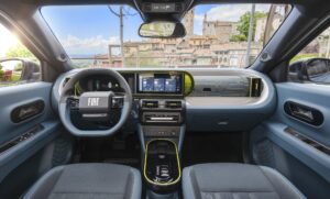 All’interno torna il richiamo al Lingotto: lo si ritrova nella cornice circolare dei display digitali, dove una simpatica Panda prima serie percorre la celebre curva del tetto-pista, ma anche intorno al blocco del cambio automatico E-DCT a sei marce. Nella versione top di gamma spiccano sedili in tessuto riciclato e finiture con fibra di bamboo a rivestire la classica – e sempre ingegnosa – vasca portaoggetti davanti al passeggero.