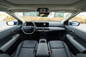 Sulle strade dell’entroterra di Marbella la EV4 ha mostrato un carattere equilibrato. Il comfort è buono, con sospensioni (davanti MacPherson e dietro multilink) tarate per assorbire le asperità senza compromettere la stabilità nei cambi di direzione. L’assetto infatti è ben calibrato e in una strada tortuosa come quelle affrontate in questa prova è riuscito a celare il peso non indifferente di circa 1900 kg. In abitacolo regna il silenzio, complici i doppi vetri che isolano bene dai rumori esterni. Il motore da 204 cv offre una spinta progressiva e adeguata, con lo 0-100 km/h coperto in 7,7 secondi, che rende la marcia fluida in città e sicura nei sorpassi in autostrada. I consumi registrati dal computer di bordo in questa prima presa di contatto si attestano intorno ai 18 kWh/100 km, un dato superiore al dichiarato ma in linea con le rivali e comunque sufficiente a garantire autonomie concrete.