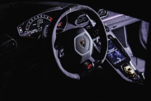 Strumentazione nota, firma Lamborghini se ce n’è una. L’Alcantara sul volante è un’esperienza sensoriale, ancor di più in contrasto con il liscio della base, con il liscio delle razze. Molecolare. Il Toro qui davanti, il tasto rosso per le tre indoli – Strada, Sport, Corsa – le rientranze per stringere i pugni sulle dieci e dieci, i due paddle sovradimensionati. E poi questo cruscotto, con una parabola a indicare i giri motore e fare da aureola al numero di marcia, con temperature, pressioni, livelli, forza G (forza G, che trionfo), tutto in un Matrix da sesto millennio.