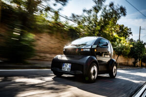 La prima cosa che colpisce è il posto di guida centrale (il passeggero è dietro, sale agevolmente e viaggia abbastanza comodo), e, soprattutto, oltre alle grandi superfici vetrate, le porte che si aprono a elitra, (in pratica verticalmente), una soluzione davvero ideale per gli spazi cittadini molto stretti. In questo modo, poi, non corrono alcun pericolo ciclisti, motociclisti e pedoni. Valore aggiunto e fattore di versatilità la possibilità di scegliere il lato dove uscire dal veicolo: destra o sinistra, allo stesso modo.