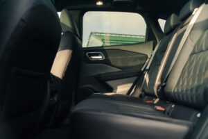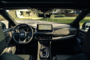 All’interno ritroviamo l’ambiente curato al quale ci ha già abituati la terza serie sin dagli esordi; si tenga presente poi che la versione in prova è in allestimento Tekna +, l’Everest del listino Qashqai, con tutto (e di più..) di serie. Sellerie denominate “Monoform” con coperture in pelle premium caratterizzate da una bella trapuntatura, plancia con un inserto tipo Alcantara con cuciture a vista, Head Up Display, tetto panoramico con tendina elettrica; insomma, se non siamo nel lusso, quantomeno è facile sentirsi molto vicini al concetto.