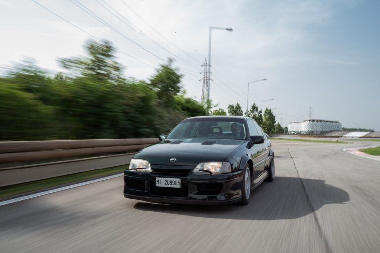 Ivan Capelli alle prese con la Opel Omega Lotus, supercar a tre volumi del 1990 commissionata dalla GM per competere con le rivali come la Lancia Thema Ferrari