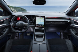 Il volante in pelle è “tagliato” sopra e sotto, mentre i pedali sono in alluminio traforato come su una vera GT. Il conducente dialoga con il sistema digitale OpenR di Renault composto da due display a forma di “L”: un driver display orizzontale da 12,3” sul cruscotto e un touchscreen verticale da 12” al centro della consolle.