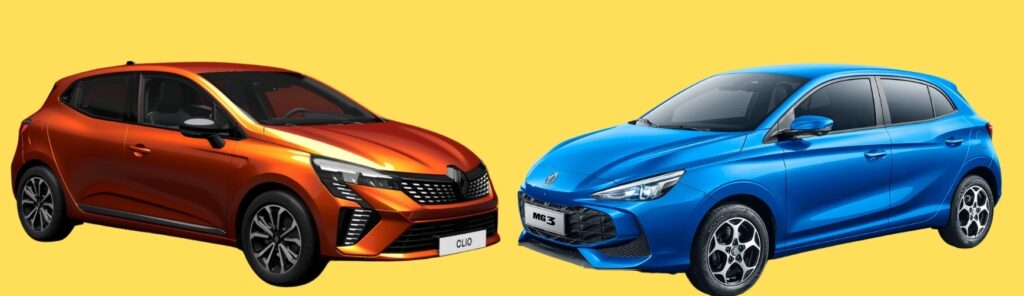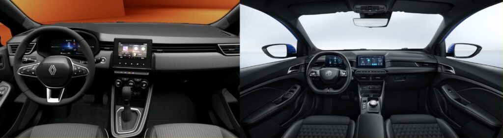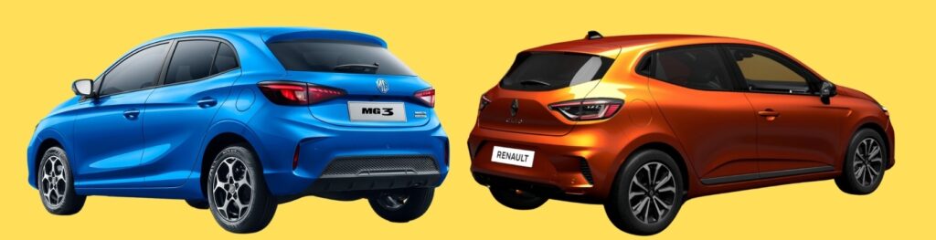La Clio e la MG3 sono due utilitarie molto “pepate” e briose. Si distinguono per l’estetica moderna e dinamica e per i powertrain di tipo full, che garantiscono una percorrenza quasi elettrica in città e consumi ridotti. Questi ultimi sono simili in entrambe le vetture, con la MG si fa preferire per un powertrain più spinto per maggiore andamento in elettrico (la batteria è più capiente).
