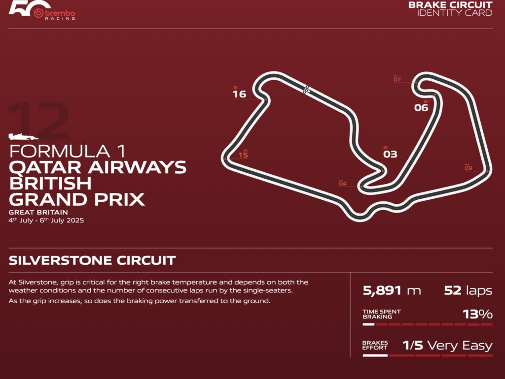 La curva più dura di Silverstone per l’impianto frenante è la 3 in cui le monoposto passano da 295 km/h a 130 km/h in 2,33 secondi durante i quali percorrono 115 metri. In quegli istanti i piloti subiscono una decelerazione massima di 4,5 g ed esercitano un carico sul pedale del freno di ben 152 kg. La potenza frenante è di 2.260 kW.