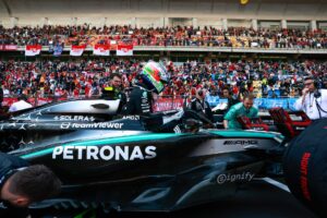 Sono abbastanza scaramantico. Scendo e salgo dalla macchina sempre dal lato sinistro, anche perché è molto più comodo dove sono posizionato nel box Mercedes. Però l’ho sempre fatto. Nel riscaldamento fisico faccio sempre gli stessi esercizi e nello stesso ordine. E poi piego sempre i vestiti e li posiziono sempre nello stesso ordine e nello stesso modo. Poi non mi piace usare roba nuova prima di una sessione di pista. Ad esempio preferisco usare gli stessi guanti, ma quest’anno la sfiga è che i guanti sono bianchi e dopo una sessione diventano neri. Però lo faccio lo stesso, perché quando sono nuovi il feeling sul volante non è lo stesso. E anche per le scarpe è la stessa cosa. Quest’anno abbiamo centinaia di scarpe e guanti ma uso sempre gli stessi. Dovrò regalarne un po’.