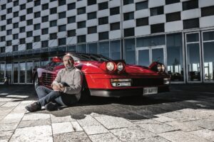 Il nostro tester d'eccezione al volante della Ferrari Testarossa, con quel suo 12 cilindri a V piatta che ha fatto la storia del cavallino